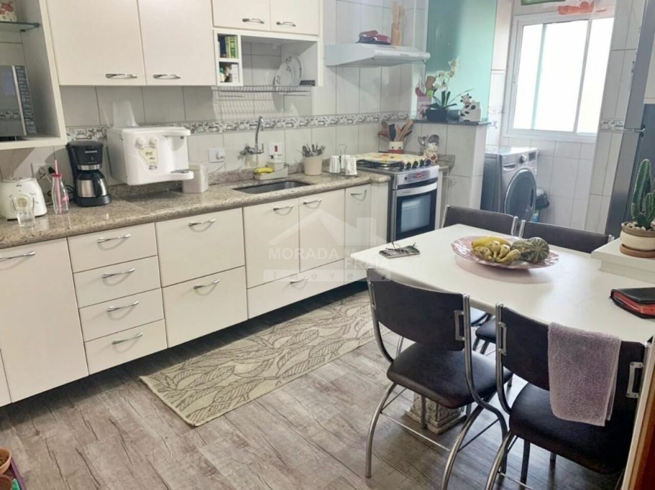 A cozinha planejada é integrada à sala de estar, criando um espaço social perfeito para receber amigos e familiares. O apartamento também conta com uma varanda, que proporciona momentos de relaxamento e contato com a brisa do mar.