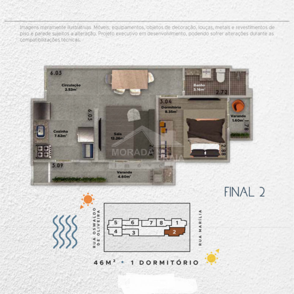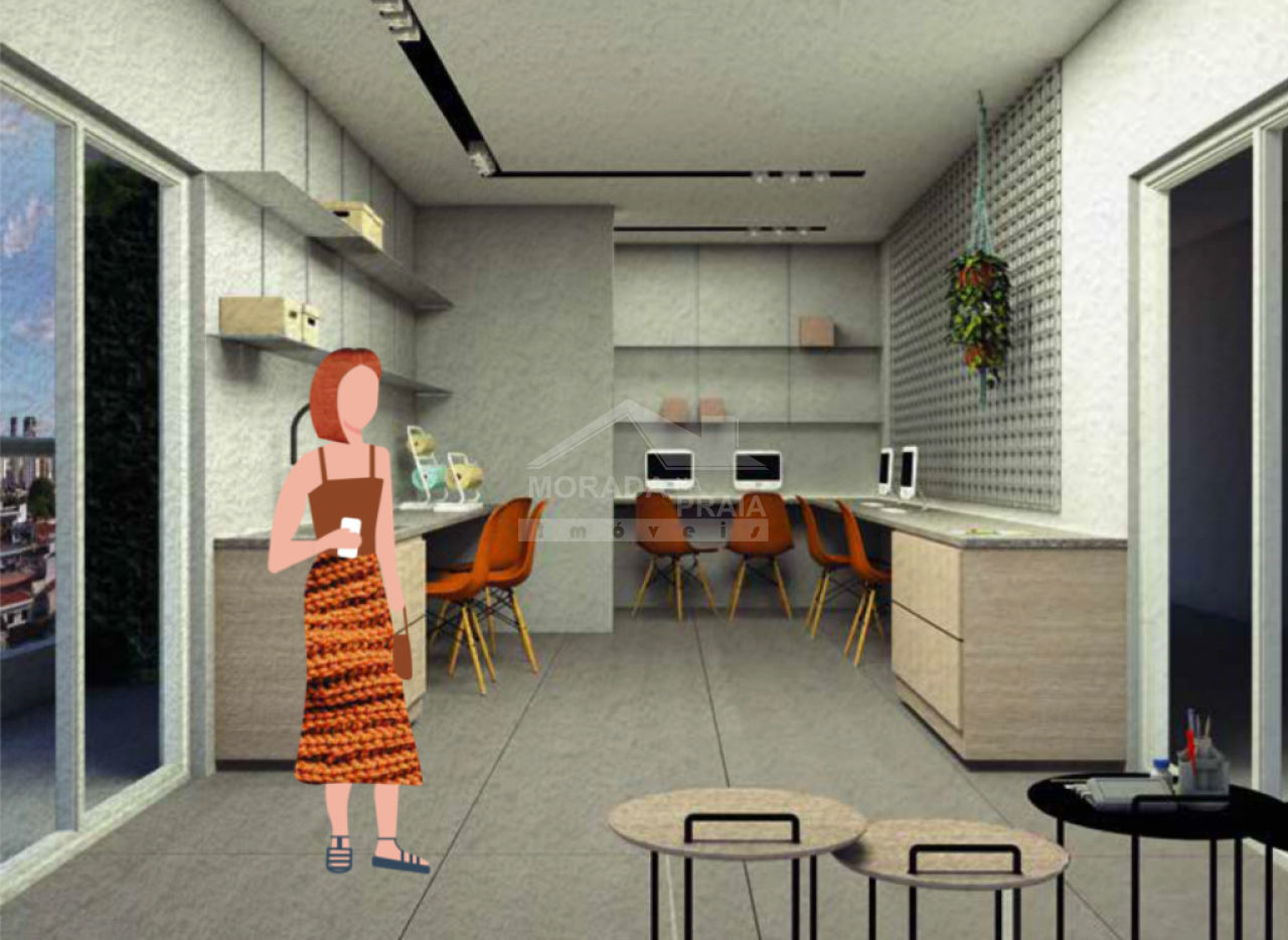 Apartamento de Alto Padrão com 01 dormitório, 01 wc social, sala 02 ambientes com churrasqueira e pia na sacada, cozinha, área de serviço e 01 vaga de garagem.